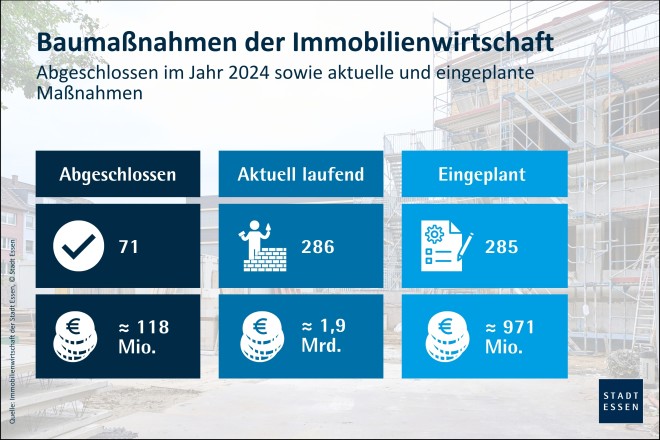 Die städtische Immobilienwirtschaft informiert jährlich über den Stand der städtischen Hochbau-Maßnahmen. Im Jahr 2024 wurden von Januar bis Dezember insgesamt 71 Projekte mit einem Gesamtvolumen von rund 118 Millionen Euro erfolgreich abgeschlossen. Zum Vergleich: Im Jahr 2023 wurden 94 Maßnahmen im Umfang von rund 53 Millionen Euro abgeschlossen.