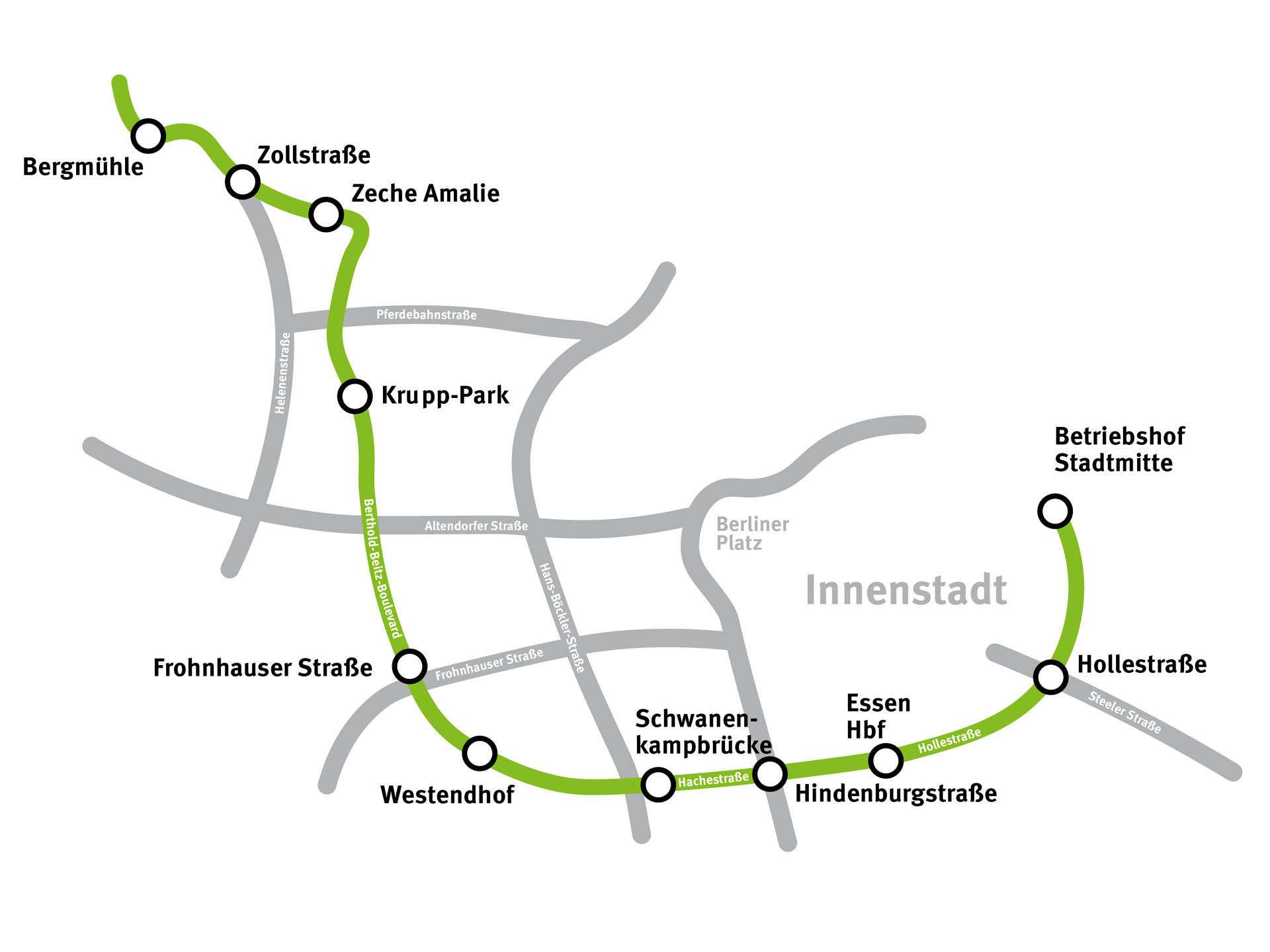 Die neue Straßenbahn-Linie 108 befährt die neue Strecke komplett von Bergeborbeck durch das Stadtquartier ESSEN 51. mit den drei Haltestellen Zollstraße, Zeche Amalie und Krupp-Park. Von dort gehe es weiter über den Berthold-Beitz-Boulevard und den Hauptbahnhof zum Wendepunkt am Betriebshof Stadtmitte. "Sie benötigt vom neuen Quartier bis zum Hauptbahnhof 8,5 Minuten", sagt Linda Kisabaka.