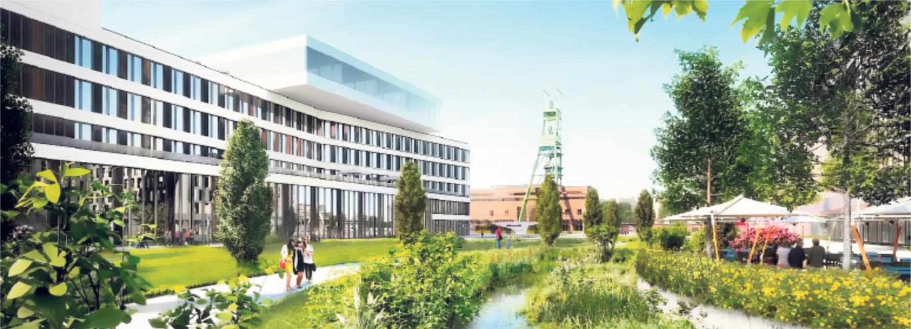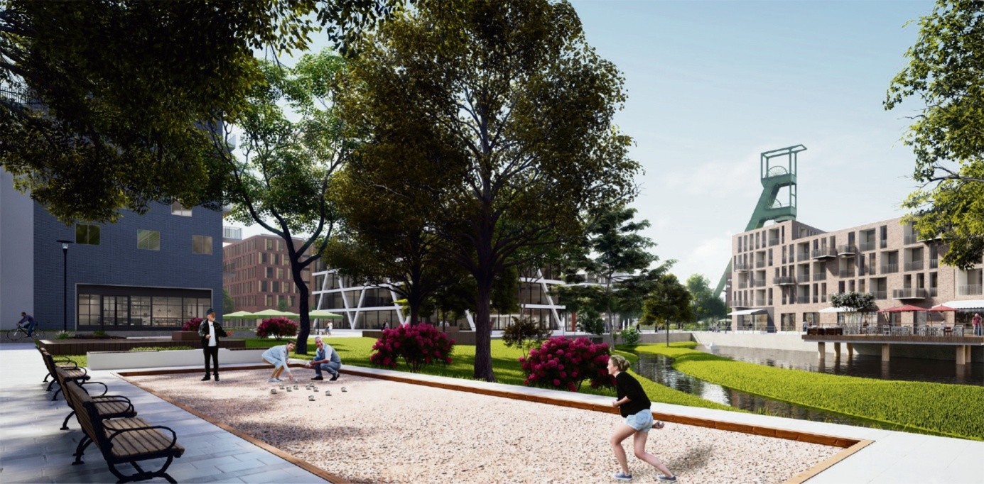 "Wir schaffen ein grünes Revier und verzichten weitgehend auf Autoverkehr. Tiefgaragen wird es unter den Wohnhäusern nicht geben", erklärt Wolfgang Thelen. "Ich bin mir sicher, dass es in 20 bis 30 Jahren weniger Privatautos geben wird." Er bedauert, dass er die Gebäude nicht mit Erdwärme beheizen kann. "Leider ist die Technik noch nicht so weit, das warme, aggressive Grubenwasser zu nutzen." Stattdessen setzt die Thelen-Gruppe auf Wärmepumpen, Solarenergie und die Umwandlung von Hochspannung auf die haushaltsübliche Niederspannung. "Natürlich sind wir auch offen für die Nutzung von Wasserstoff als Energieträger", betont er.