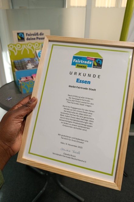 Die Stadt Essen bleibt eine "Fairtrade-Town". Zum wiederholten Mal hat Fairtrade Deutschland e.V. der Stadtverwaltung stellvertretend die entsprechende Auszeichnung verliehen. Damit erfüllt Essen weiterhin alle fünf Kriterien der internationalen Fairtrade-Towns-Kampagne, die unter dem Motto "global denken, lokal handeln" steht. Bereits seit zwölf Jahren setzt sich die Stadtverwaltung gemeinsam mit Partnerinnen*Partnern aus Politik, Wirtschaft und Zivilgesellschaft aktiv für fairen Handel ein. Erstmals erhielt Essen die Auszeichnung am 15. November 2013.